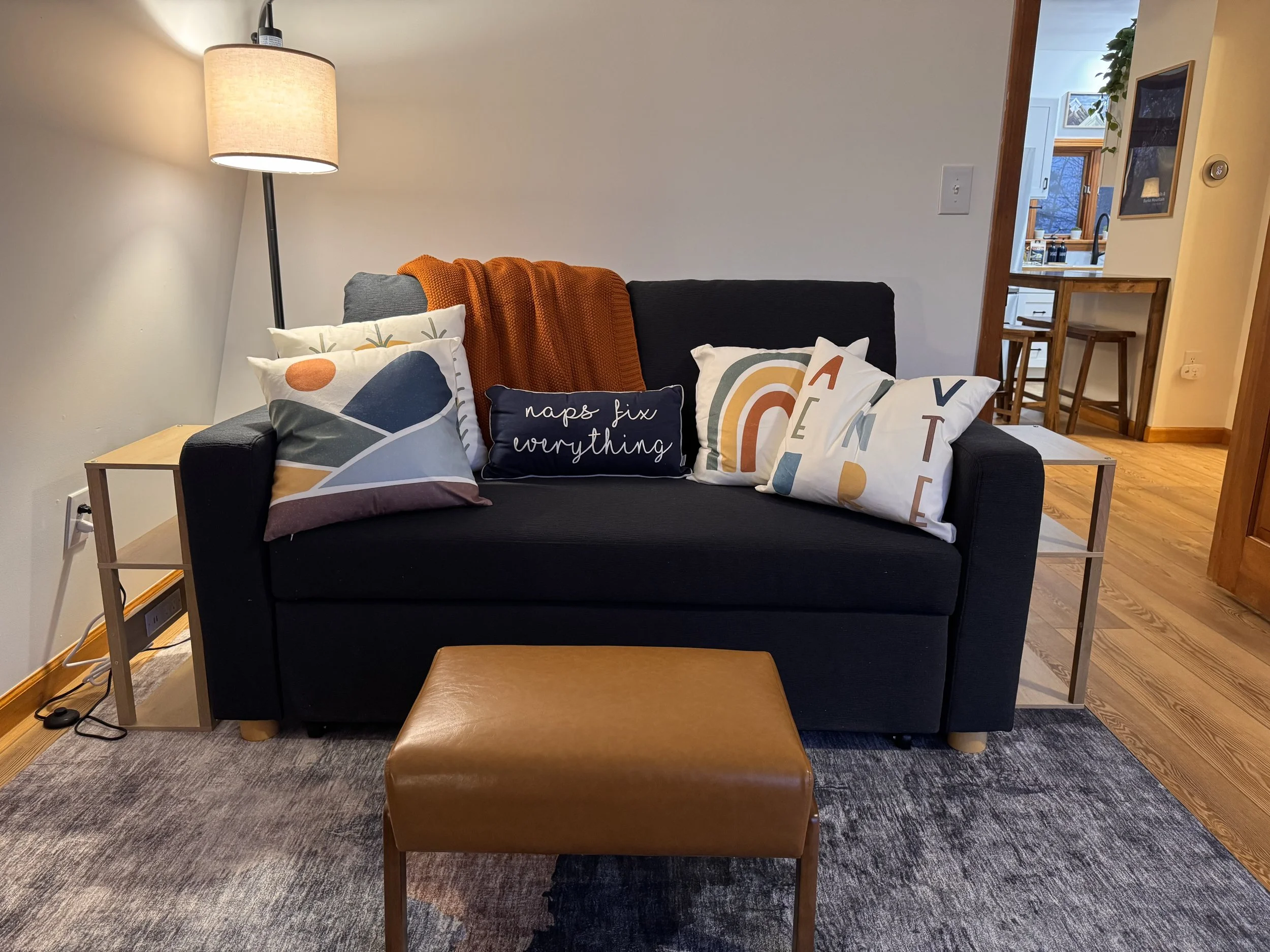 Inside, the space is light-filled and welcoming, with a super-comfortable king bed, luxe bedding, and thoughtful details throughout. A dedicated workspace with an adjustable standing desk and large Smart TV makes it easy to balance work and rest, while the open living area offers space to unwind after a day outside.